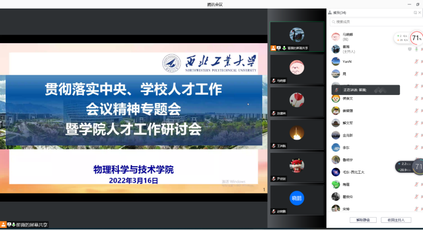 通过线上会议形式召开学习贯彻中央、学校人才工作会议精神专题会暨学院人才工作研讨会,学院党政领导班子、各团队负责人和教师代表等37人参加,会议由院长翟薇主持。